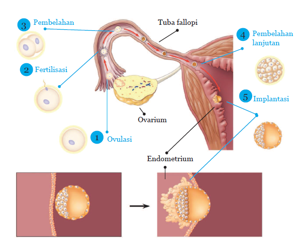 6. Fertilisasi dan Kehamilan Fertilisasi merupakan proses peleburan inti sel sperma dan sel telur sehingga membentuk zigot. Proses ini terjadi di tuba fallopi.Zigot yang terbentuk setelah terjadinya fertilisasi akan melakukan pembelahan, selanjutnya berkembang menjadi embrio yang akan menuju ke rahim kemudian tertanam (implantasi) ke dalam
