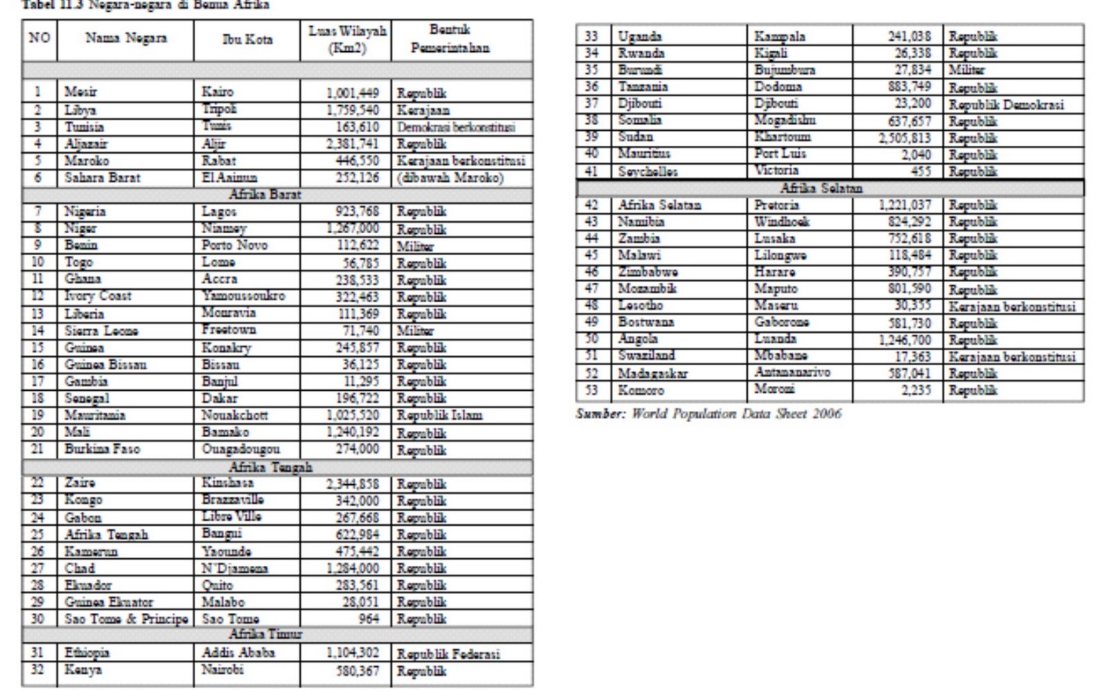 Benua Afrika terbagi menjadi beberapa kawasan, yaitu Afrika Selatan, Afrika Tengah, Afrika Barat, Afrika Timur.Keadaan Benua Afrika: